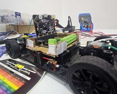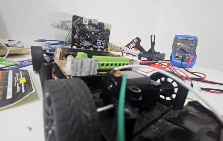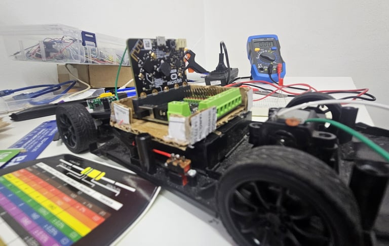 Este projeto consiste em um carrinho motorizado controlado por um microcontrolador BBC Micro:bit, acoplado a uma placa shield que facilita a conexão com motores e sensores. O objetivo é criar uma plataforma educacional para explorar conceitos de robótica, programação e eletrônica.